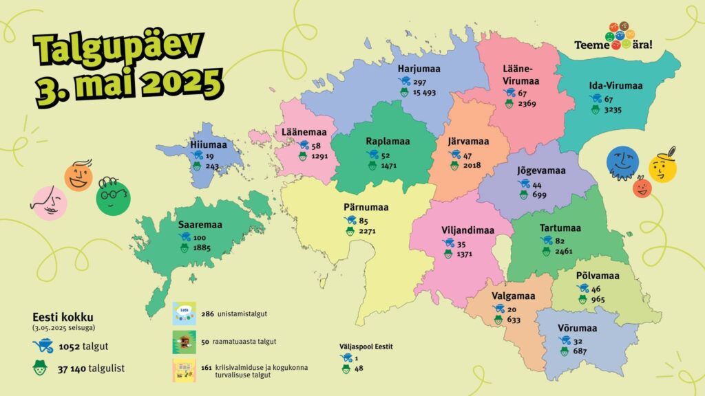 Laupäeval, 3. mail 2025, toimus üle Eesti 1052 talgut, milles osales registreeritud 37 140 talgulist!